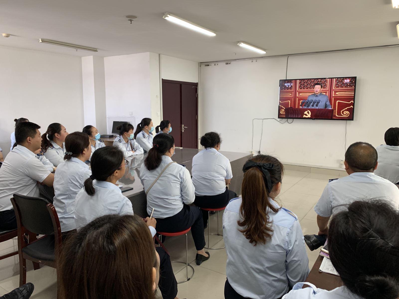 機務(wù)技術(shù)事業(yè)部黨支部組織全體黨員到會議室準(zhǔn)時收看慶祝大會,其他工作人員用電腦或手機收看。