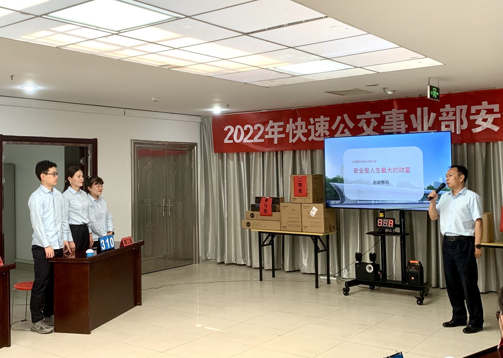 比賽最后由公交集團安全部部長于亮宣布名次和頒發(fā)此次競賽獎品,他表示,各代表隊充分展示了他們的聰明才智,為競賽增光添彩,也對此次活動給予了充分的肯定。同時指出以下三點內容:一是事業(yè)部要牢固安全發(fā)展理念,進一步做好“安全生產月”期間的各項工作,加強安全教育;二是要重視責任,包括第一責任人的責任、領導班子安全責任及全員安全責任;三是要落實應急專項演練,認真組織開展。