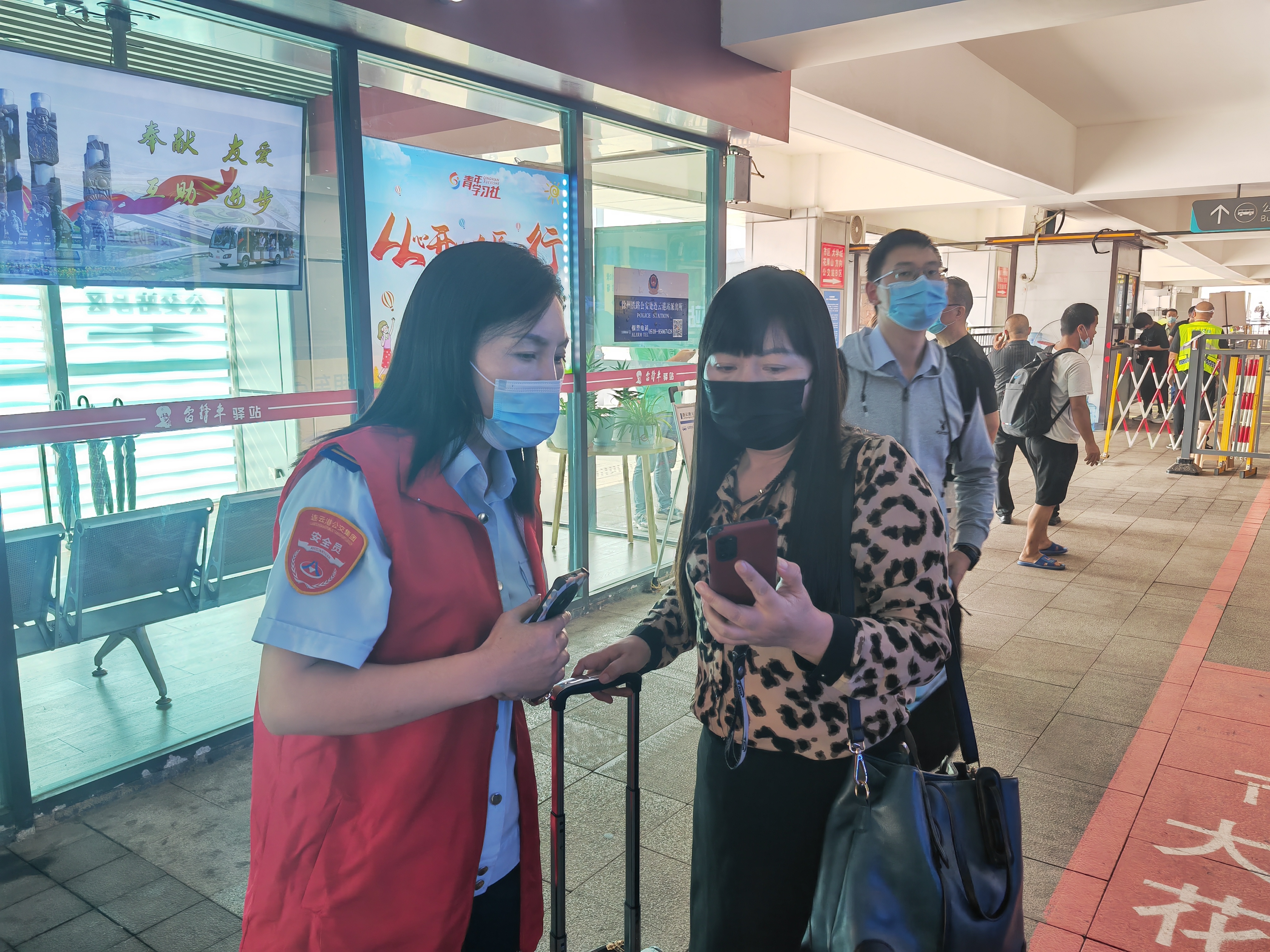 早上9點左右開始,出站客流呈上升趨勢。公交事業(yè)一部分別安排管理人員及與 “雷鋒車同行”旅游示范線駕駛員師傅們在出站口、咨詢臺及公交站臺等客流集結點進行文明綠色出行引導。針對大專院校新生首次不知如何乘車、公交出行防控碼首次如何登陸等問題,公交事業(yè)一部通過乘車方向提示牌、現(xiàn)場指導等形式高效引導乘客前往火車站B區(qū)乘坐公交車。