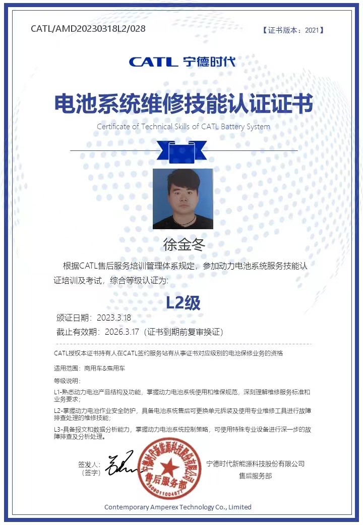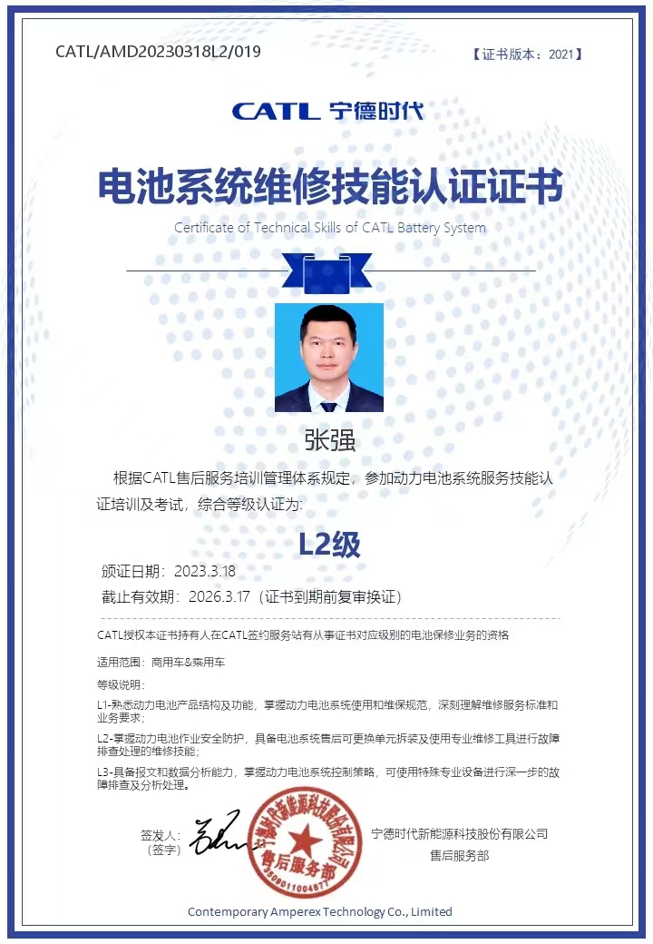 此次培訓(xùn)選派張強(qiáng)、徐金冬兩名一線維修人員參加寧德時代在武漢舉辦的《鋰動力電池》L2-A培訓(xùn),培訓(xùn)分為理論和實操,理論課內(nèi)容涉及認(rèn)識商用車電池系統(tǒng)、電池均衡;實操課涵蓋了商用車上位機(jī)使用、安全作業(yè)防護(hù)與基本維修流程、充放電作業(yè)、商用車電池箱深度拆裝等重點(diǎn)內(nèi)容,參培人員利用5天的時間,參加培訓(xùn)的人員認(rèn)真學(xué)習(xí),在實操訓(xùn)練中逐步熟悉和掌握電池拆裝及使用專業(yè)維修工具進(jìn)行故障排查處理的維修技能,最終通過理論、實操考核工作,獲得了寧德時代頒發(fā)的L2級維修技能等級證書。