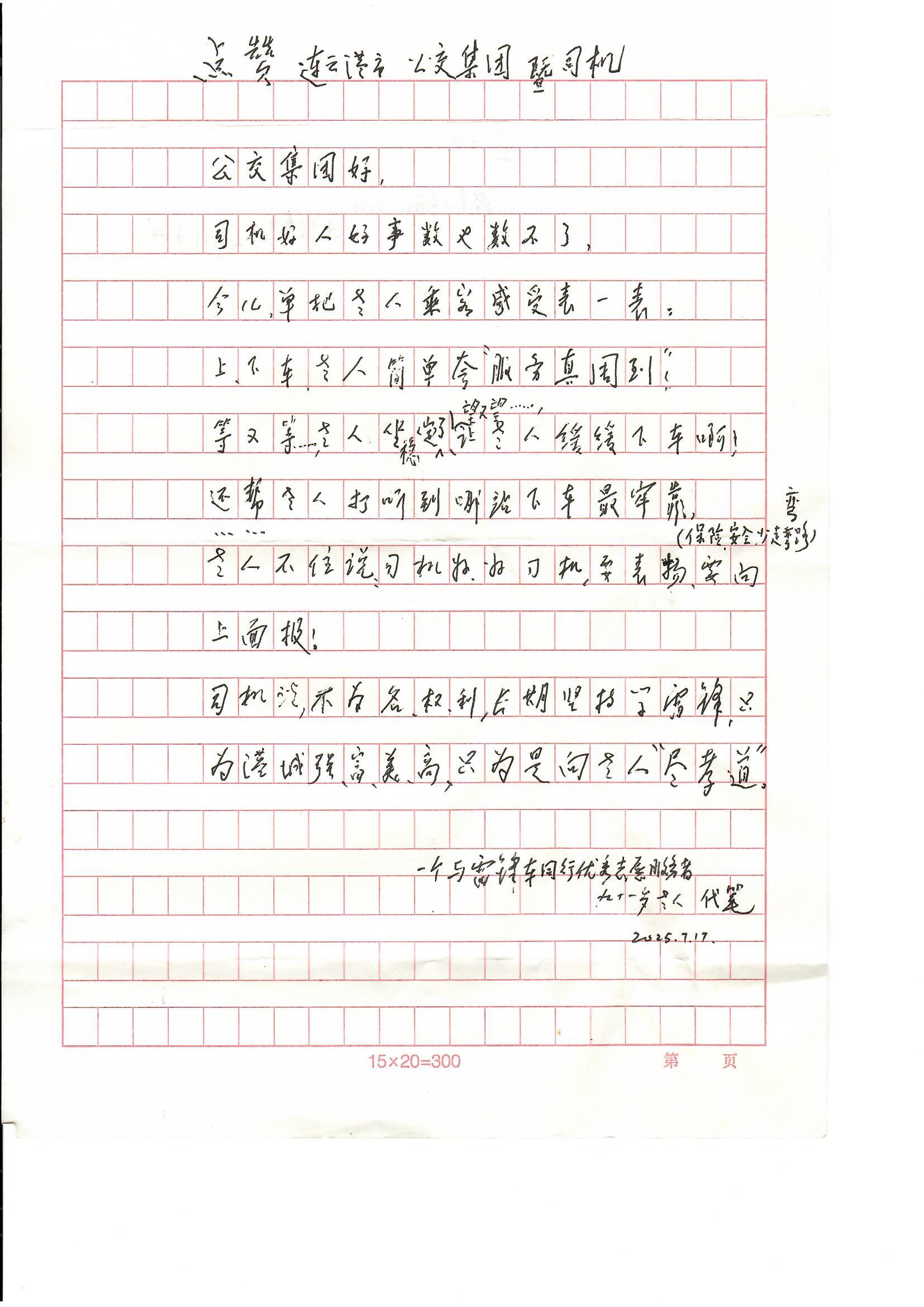 “司機(jī)好,好司機(jī),要表?yè)P(yáng)!”老人在信中反復(fù)強(qiáng)調(diào)。面對(duì)老人的稱贊,司機(jī)師傅們卻謙虛表示:“不為名利,只是堅(jiān)持學(xué)雷鋒,為港城‘強(qiáng)富美高’盡一份力,對(duì)老年乘客盡一份孝心?!?/span>