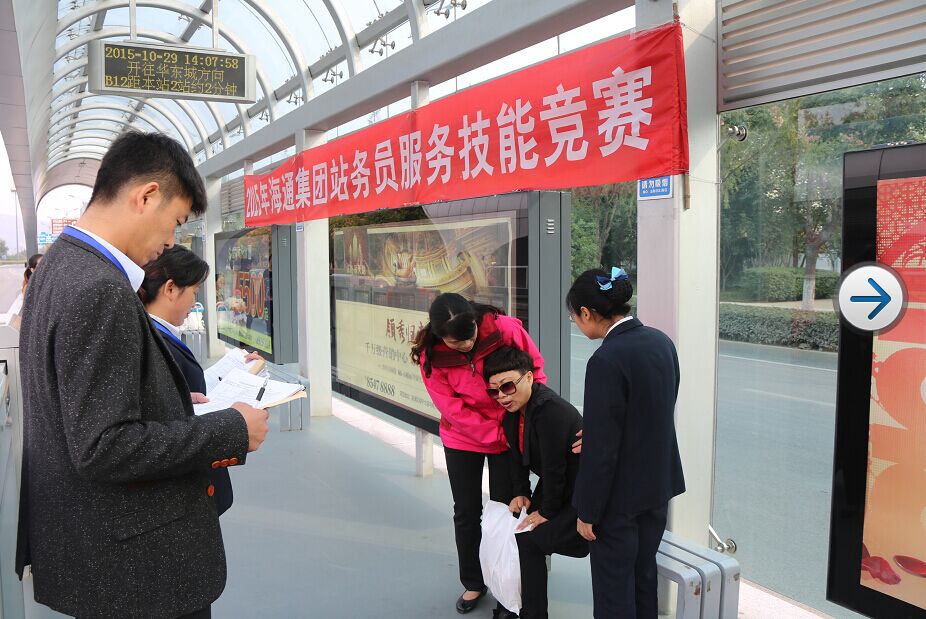 2015年10月29日,在海通集團和海通公交的籌備和組織下,快速公交站務員服務技能競賽活動圓滿結(jié)束。本次技能競賽分為理論考試和現(xiàn)場技能考核兩個部分。56名站務員參加初選,經(jīng)過嚴格選拔, 16名優(yōu)秀站務員被選拔出來參加決賽,決賽在郁海廣場上行站進行,分為禮儀服務、售票操作、應急處理、安全檢查等環(huán)節(jié)評比,并對站務員進行綜合打分。