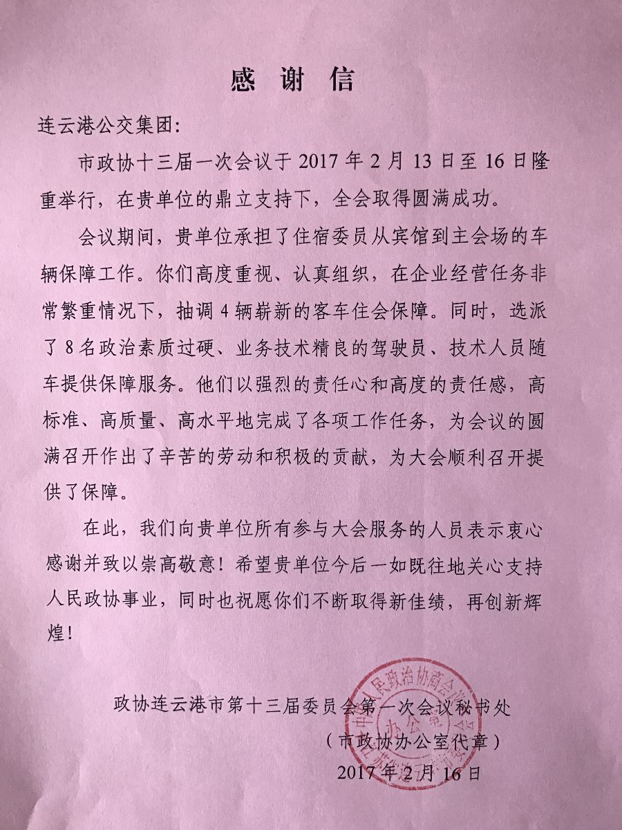 來(lái)源:綜合辦公室 作者:倪子棠 2月20日,市政協(xié)秘書長(zhǎng)劉玉君、副秘書長(zhǎng)張孝昌等相關(guān)人員來(lái)到公交集團(tuán),對(duì)公交集團(tuán)圓滿完成兩會(huì)期間交通運(yùn)輸保障工作給予了充分肯定,并向辛苦付出的駕駛員和工作人員致以感謝和慰問,并致以感謝信。 2017年2月13日—16日,我市隆重舉行市政協(xié)十三屆、市人大十四屆一次會(huì)議,公交集團(tuán)承擔(dān)了兩會(huì)期間住宿委員從賓館到主會(huì)場(chǎng)的車輛保障工作。公交集團(tuán)高度重視、召開專題會(huì)議,周密安排,認(rèn)真落實(shí),抽調(diào)20輛嶄新的客車住會(huì)保障,選派政治素質(zhì)過硬、業(yè)務(wù)技術(shù)精良的駕駛員、技術(shù)人員隨車提供保障服務(wù),他們以強(qiáng)烈的責(zé)任心和高度的責(zé)任感,高標(biāo)準(zhǔn)、高質(zhì)量、高水平地完成了工作任務(wù),為會(huì)議的圓滿召開做出了辛苦的勞動(dòng)和積極的貢獻(xiàn),受到了會(huì)代表的一致稱贊。