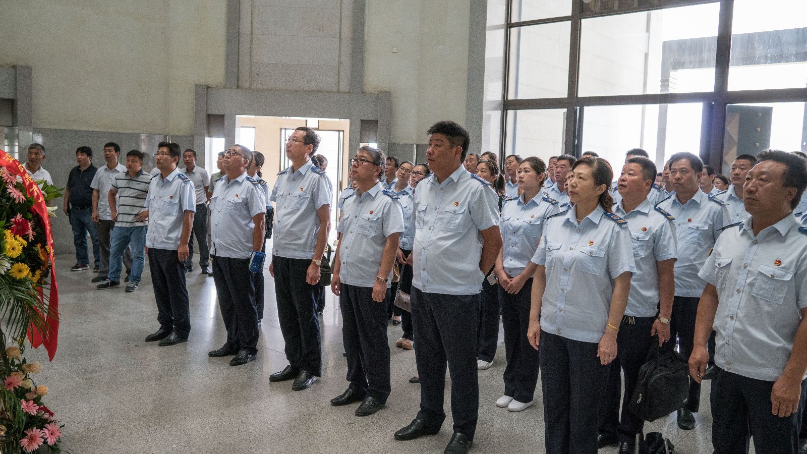 上午9:00,公交黨員、干部一行,在講解員的引導(dǎo)下,排著整齊的隊(duì)伍,來到紀(jì)念館。在莊嚴(yán)肅穆中,向總理座像敬獻(xiàn)花籃、三鞠躬,在周恩來漢白玉座像前,全體黨員重溫了入黨誓詞。