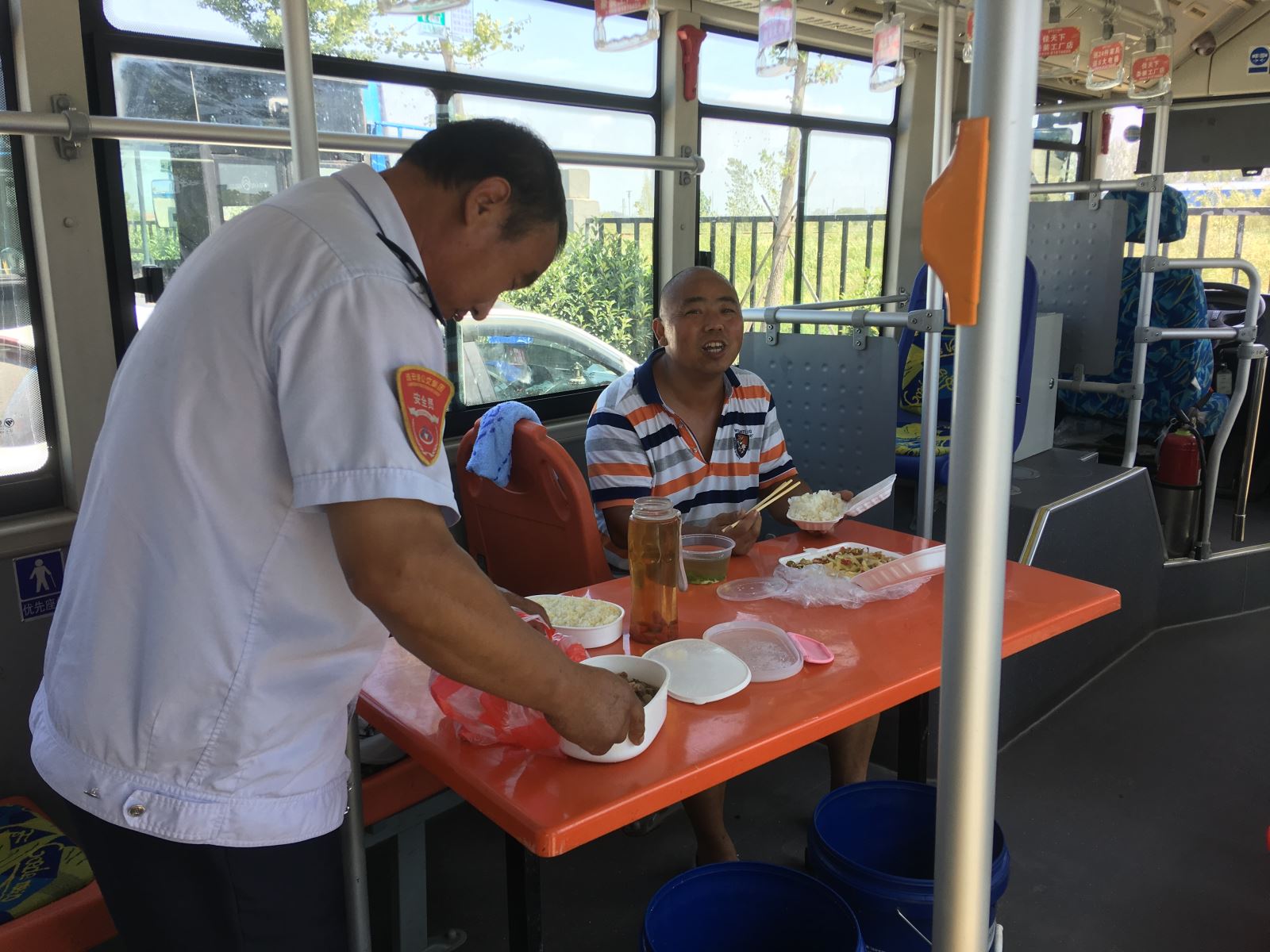 即使是在高溫天氣,為了保證市民乘客的日常出行,港城的公交人們?nèi)淌苤邷乜崾钜琅f堅(jiān)守崗位,默默地?fù)]灑著汗水。公交集團(tuán)海通公交公司為切實(shí)踐行“分公司為一線駕駛員服務(wù)”的服務(wù)理念,各分公司實(shí)行輪流值班制,在線路車輛密集的西城公交停車場,上午10:30左右,公司安排一輛電動(dòng)車停放場內(nèi),車上擺放了簡易餐桌和飲用水供駕駛員休息、吃飯使用。