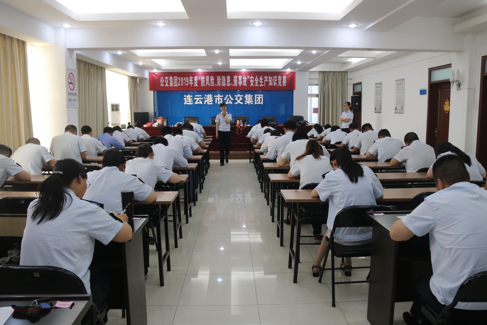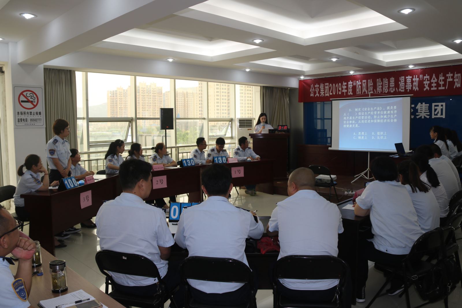 為扎實推進(jìn)全國第十八個“安全生產(chǎn)月”活動的深入開展,全面加強(qiáng)安全生產(chǎn)宣傳教育,普及安全生產(chǎn)知識,提高職工安全素養(yǎng)和自我保護(hù)能力,6月27日,公交集團(tuán)在三樓會議室開展了“防風(fēng)險、除隱患、遏事故”安全生產(chǎn)知識競賽,集團(tuán)黨委書記、總經(jīng)理周文君,副總經(jīng)理羅軍,副總經(jīng)理、工會主席劉永善,各職能部門負(fù)責(zé)人及集團(tuán)權(quán)屬單位領(lǐng)導(dǎo)班子、安全管理人員共70余人參加了此次活動。