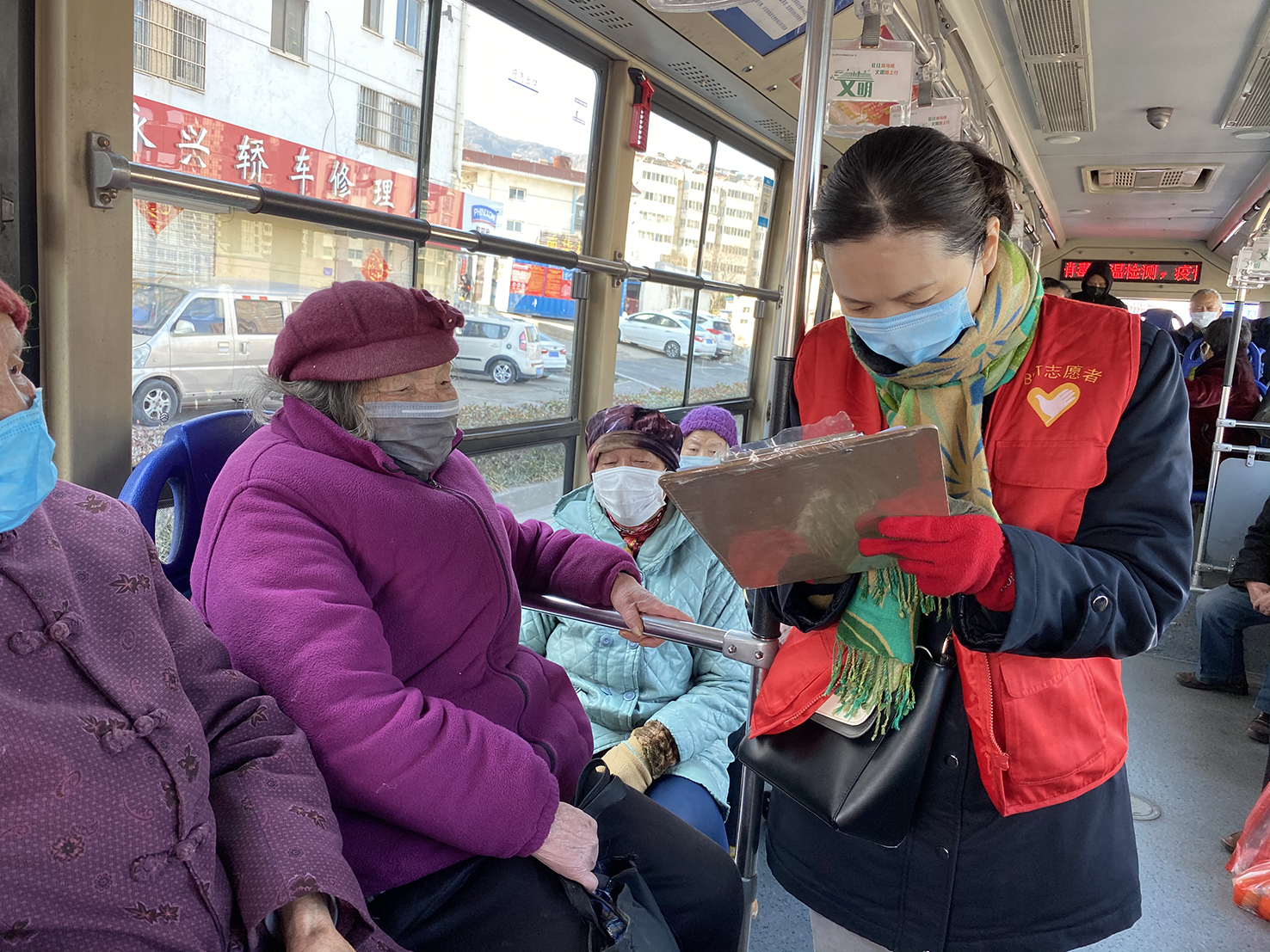 東部城區(qū)公交31路自園丁小區(qū)發(fā)車,終點(diǎn)站連云古鎮(zhèn),每天的乘客老年人占大多數(shù)。為更好地宣傳疫情防護(hù)工作,3月5日公交事業(yè)二部13名志愿者分兩人一組,到公交31路車廂內(nèi)開展志愿服務(wù)活動(dòng)。引導(dǎo)乘客申請“連易通”二維碼,并正確使用。但是31路公交車上老年人居多,最多的一趟班次中,共35人乘車,其中有33位是老年人,有一些年齡大的老人,連自己的電話都記不得。志愿者們提前做好功課,了解31路乘車群體特征,準(zhǔn)備了登記簿,詳細(xì)、耐心地為這些不能出示“連易通”二維碼的老年乘客進(jìn)行姓名、社區(qū)、聯(lián)系方式登記,還勸說老年乘客非必要盡量減少外出,無法出示的“連易通”綠色二維碼請家人幫忙申請并打印后隨身攜帶。